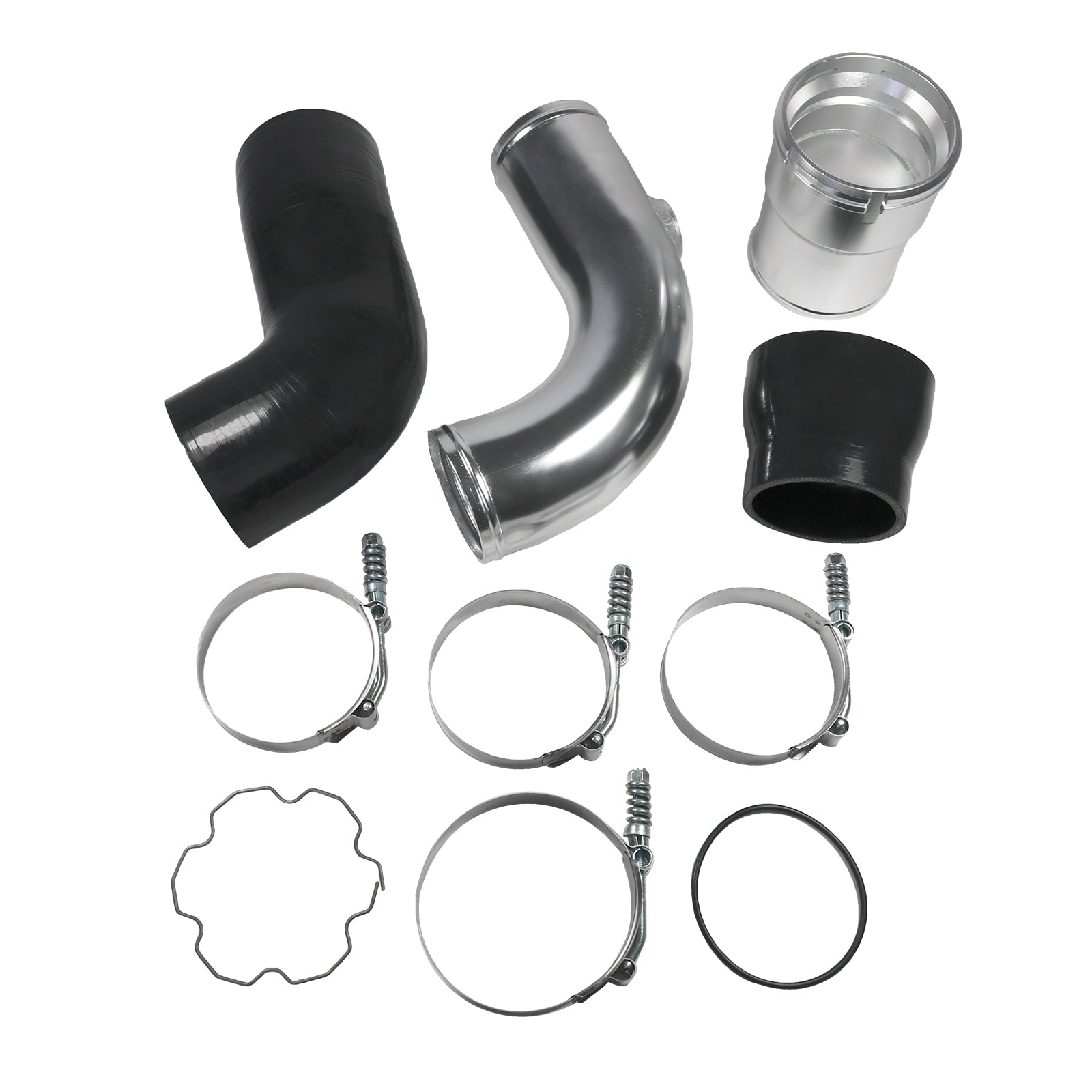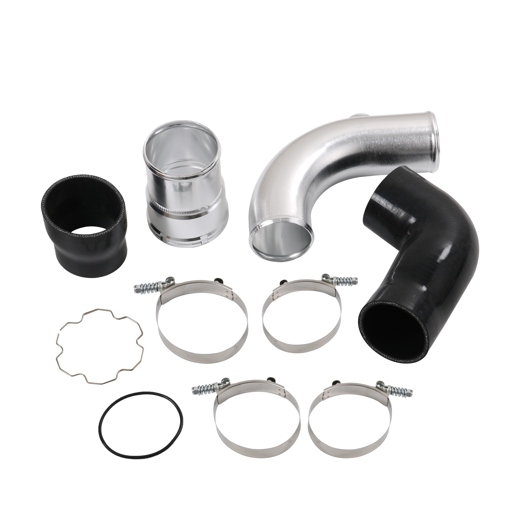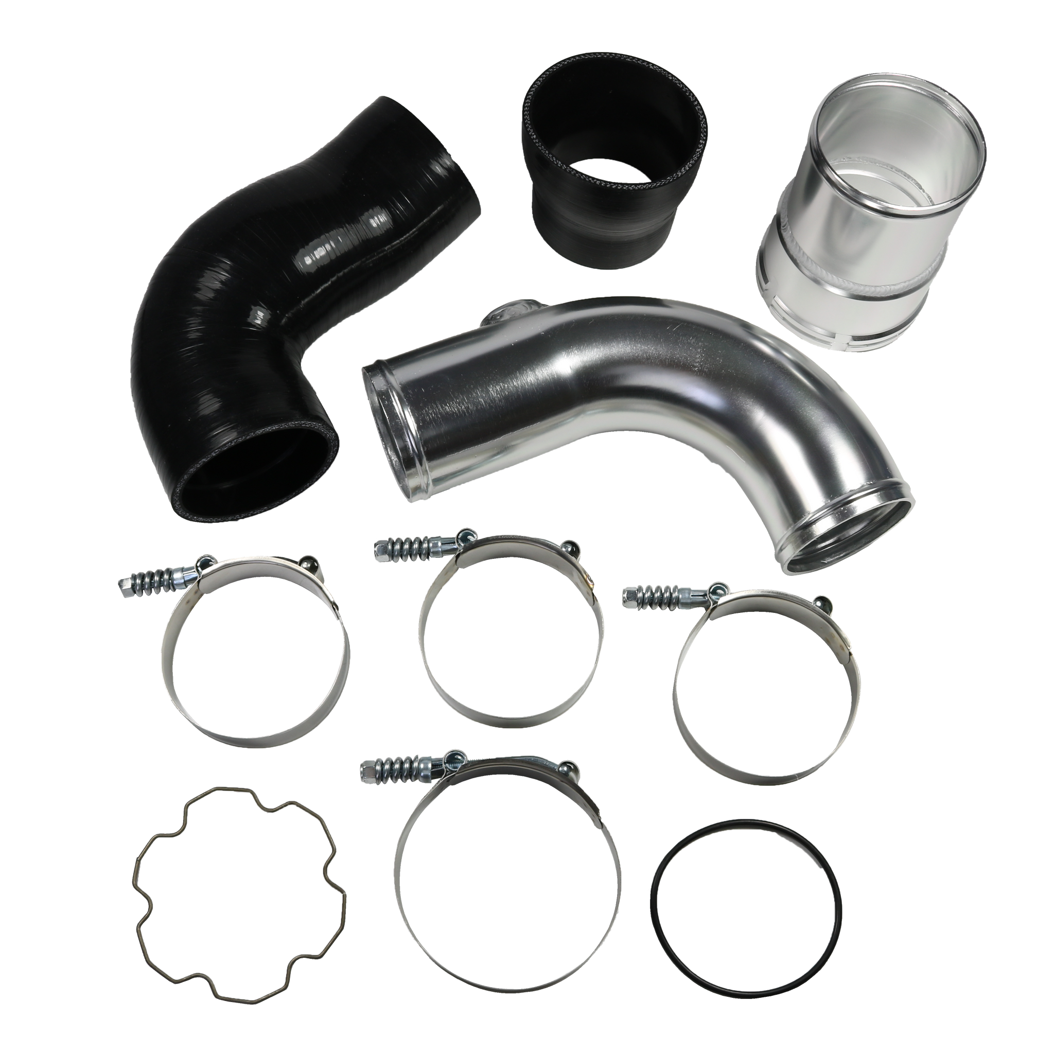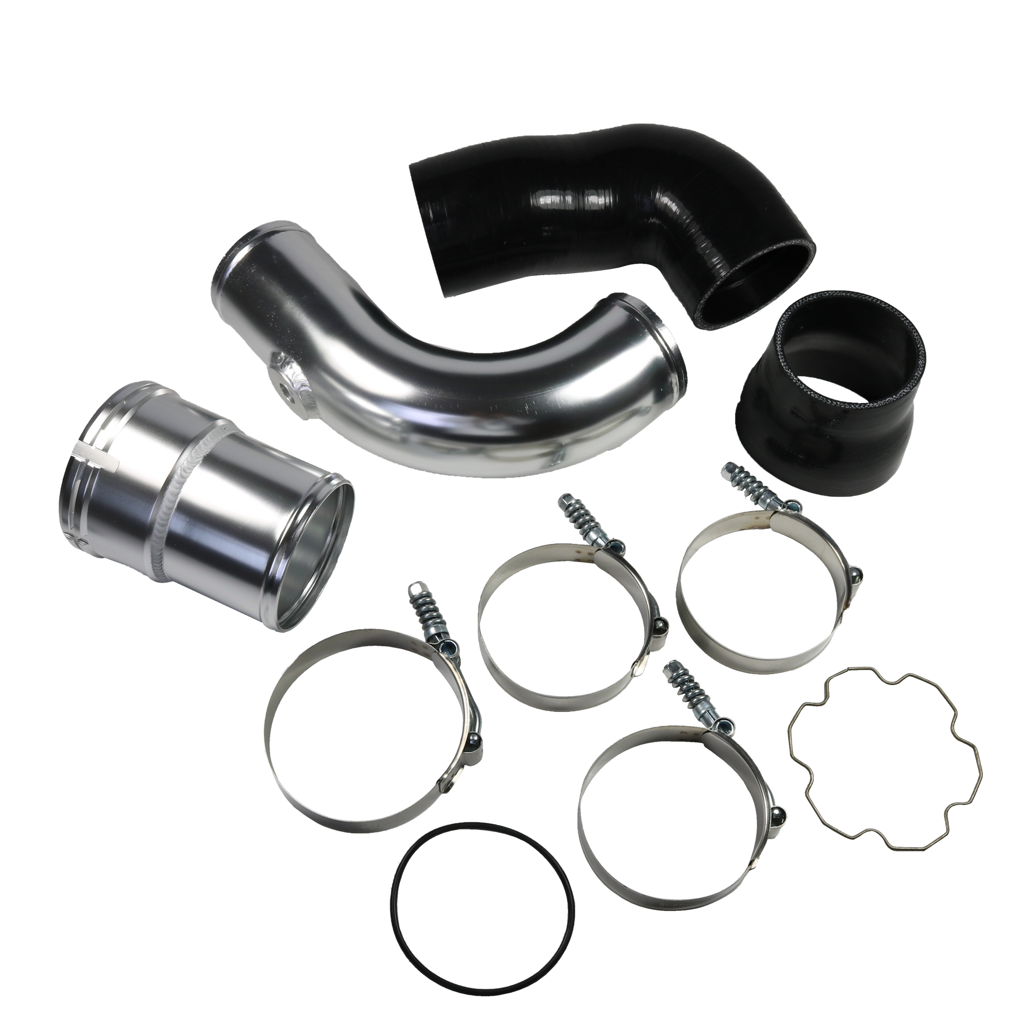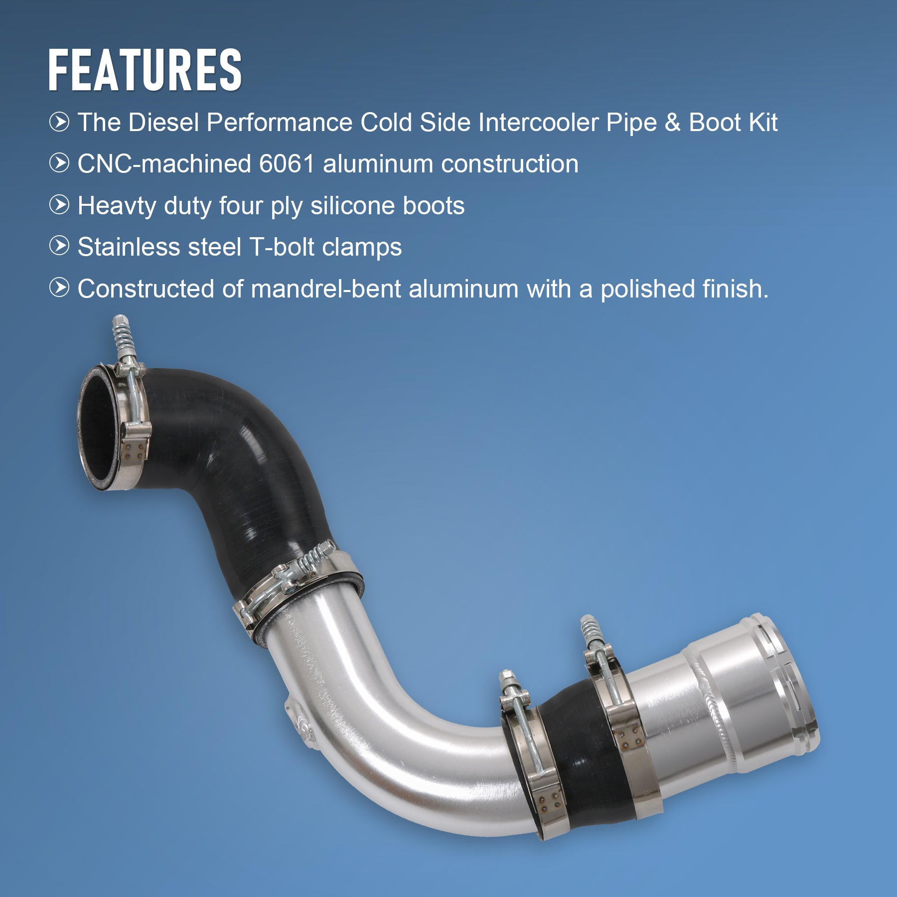 Constructed of mandrel-bent aluminum with a polished finish. A 100% CNC-machined 6061 aluminum coupling allows you to retain your trucks factory emissions components and allows for a quick install. The Diesel Performance cold-side pipe eliminates restrictive bends in the factory pipe, allowing for improvements in airflow, power, and EGTs. To add even more reliability this kit includes Diesel Performance Constant-Tension T-bolt Clamps for accurate and consistent holding power. This cold-side pipe and boot kit is the perfect addition to your 6.7L Powerstroke truck.