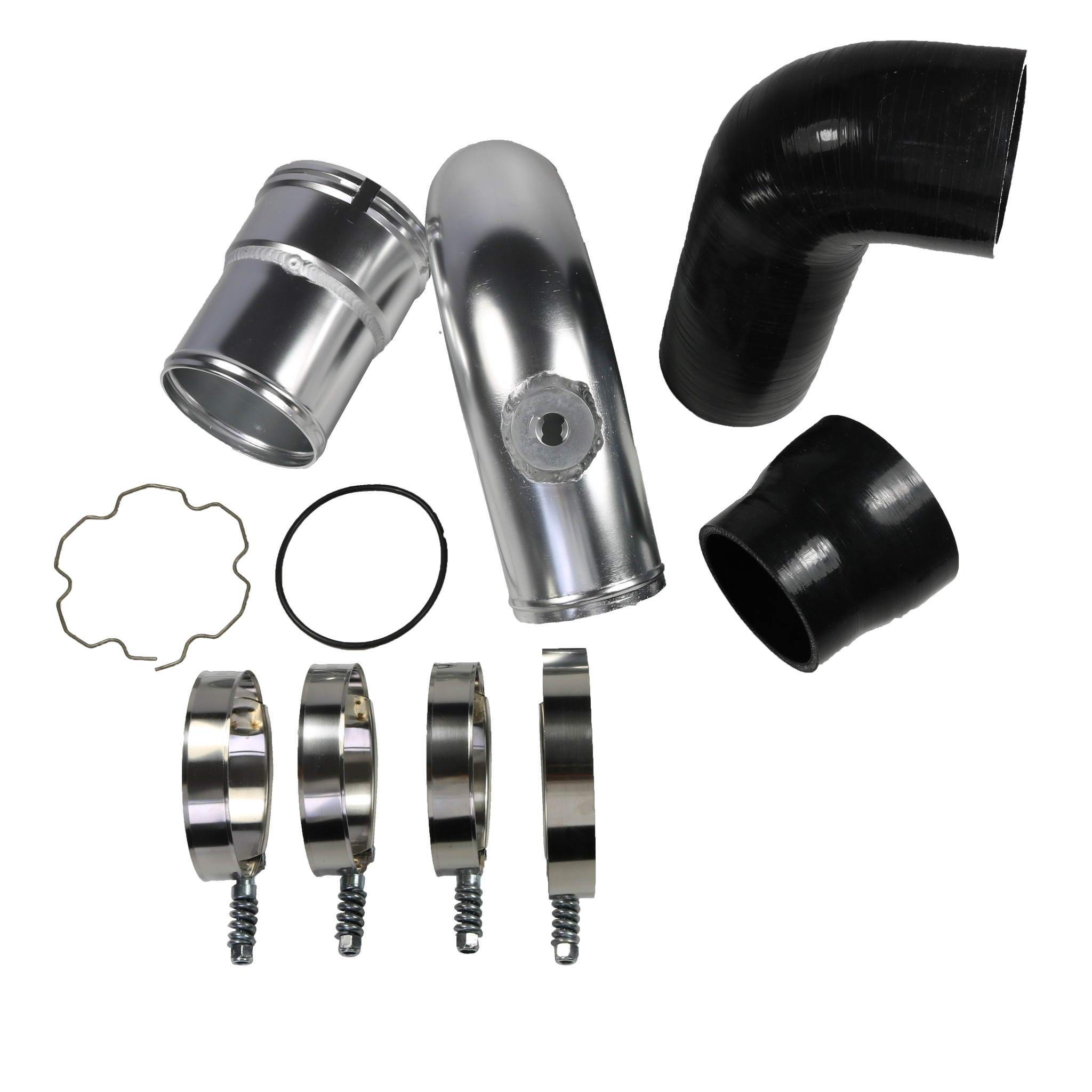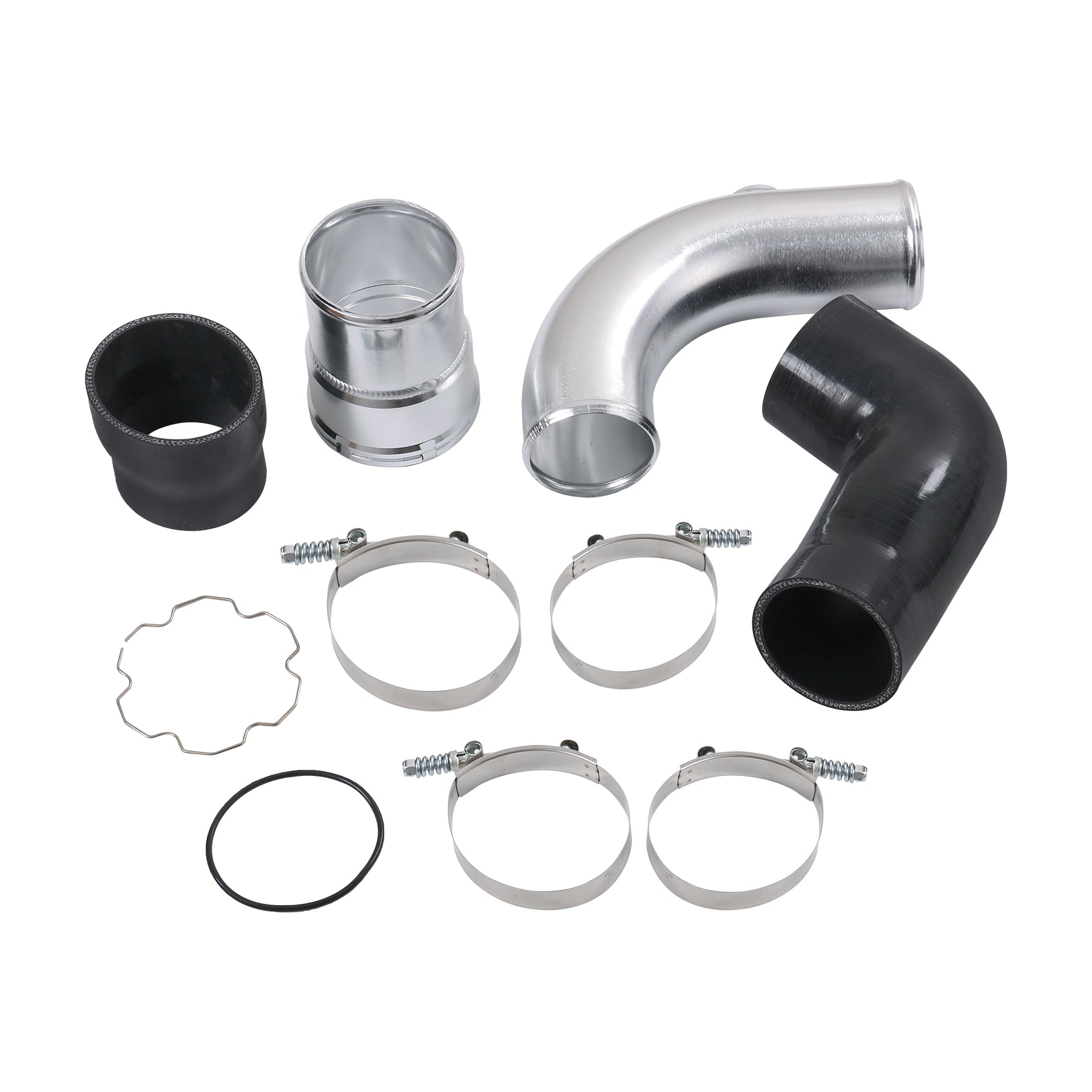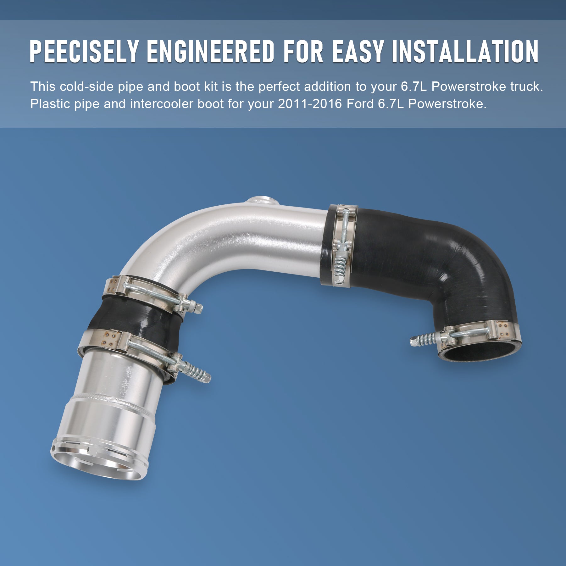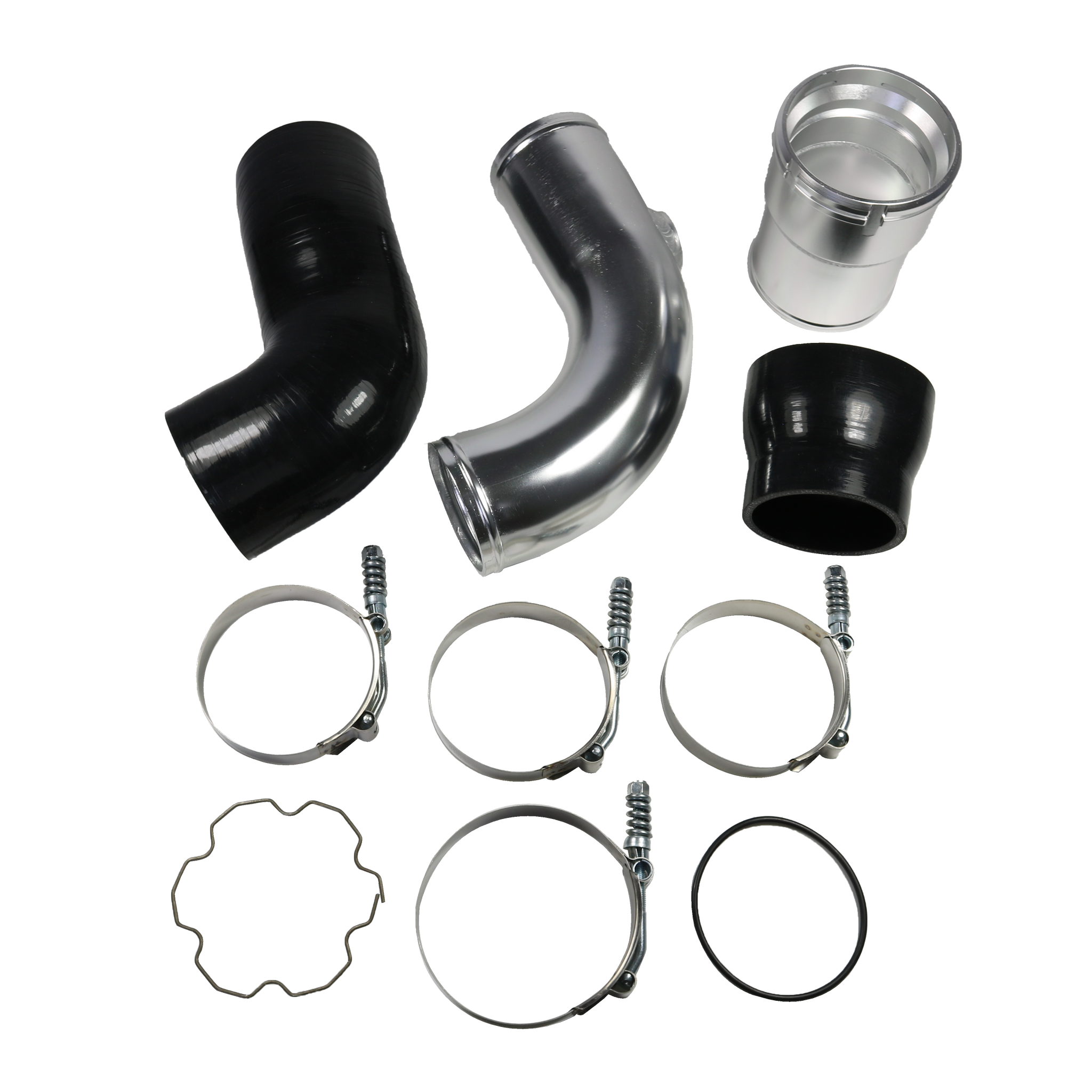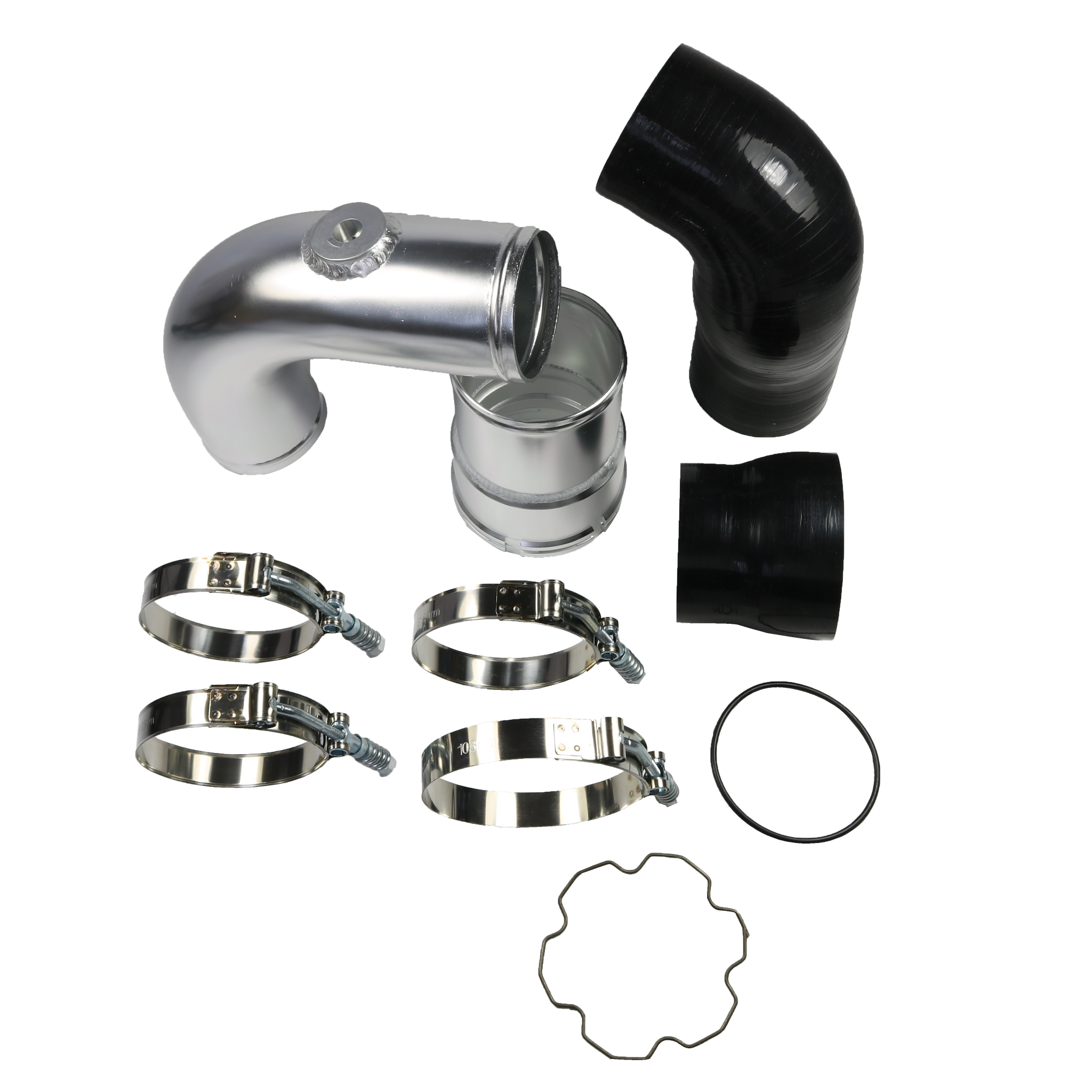 Constructed of mandrel-bent aluminum with a polished finish. A 100% CNC-machined 6061 aluminum coupling allows you to retain your trucks factory emissions components and allows for a quick install. The Diesel Performance cold-side pipe eliminates restrictive bends in the factory pipe, allowing for improvements in airflow, power, and EGTs. To add even more reliability this kit includes Diesel Performance Constant-Tension T-bolt Clamps for accurate and consistent holding power. This cold-side pipe and boot kit is the perfect addition to your 6.7L Powerstroke truck.