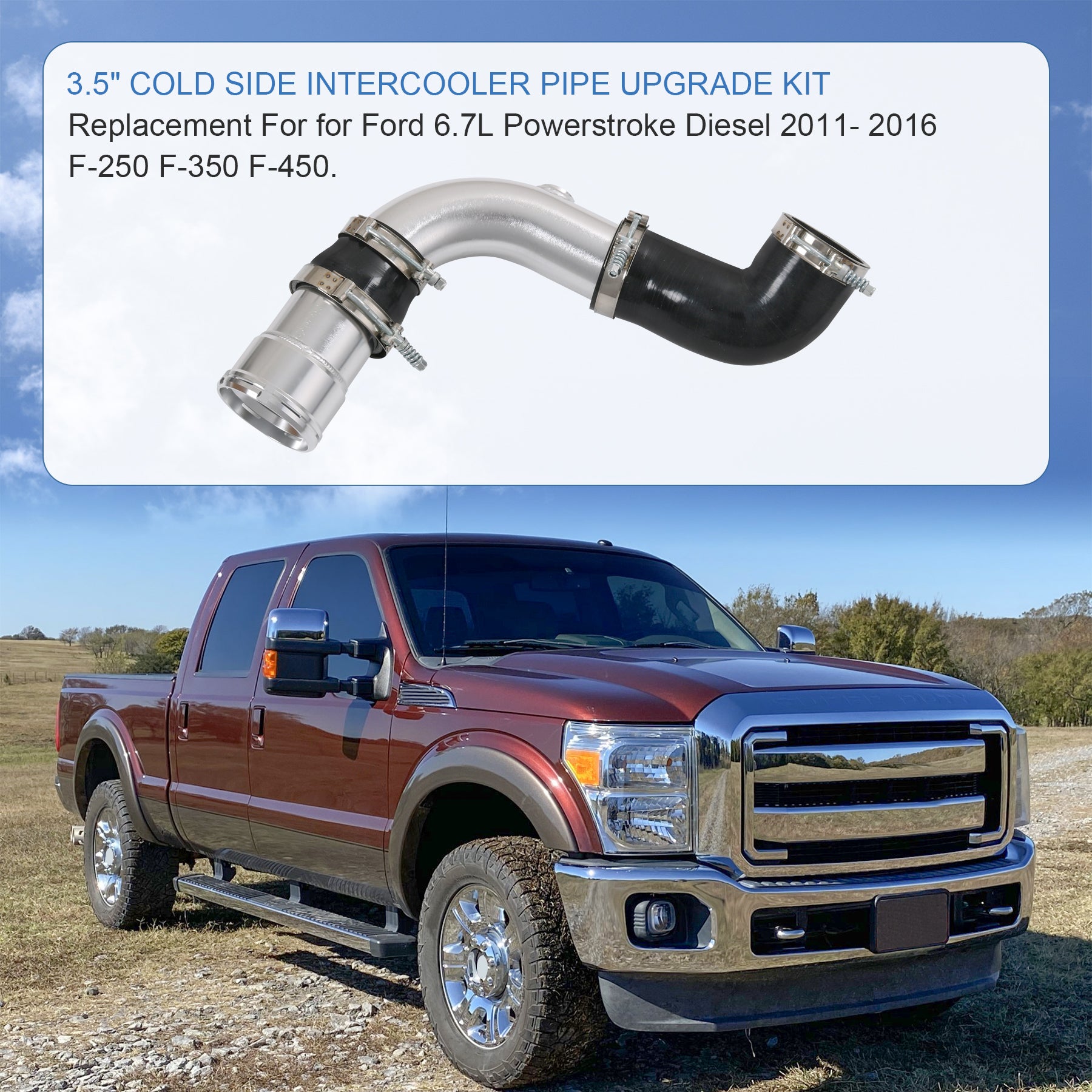 The Diesel Performance Cold Side Intercooler Pipe & Boot Kit for your 2011-2016 Ford 6.7L Powerstroke solves the common issues with the factory supplied plastic pipe and intercooler boot, that are known to explode or burst due to the heat and boost levels of your 6.7L Powerstroke. The upgraded design from Diesel Performance increases reliability, durability and performance. Constructed of mandrel-bent aluminum with a polished finish. A 100% CNC-machined 6061 aluminum coupling allows you to retain your trucks factory emissions components and allows for a quick install.